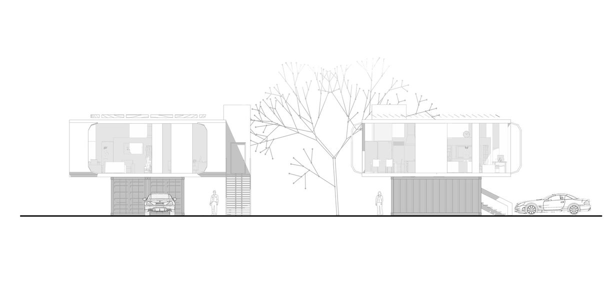 Дом для Стива Джобса спроектирован из прототипа корпуса Пауэрмака G5, перевернутого и увеличенного в 25 раз. На контрасте здесь – рукотворная идеальность, воплощенная в чистой и высокотехнологичной форме корпуса Мака с главой-процессором компании внутри и не-идеальность во вне: ресайкл из деревянного бруса для входного блока и гараж из старых морских контейнеров.