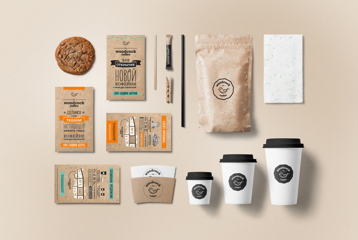 Для кофейни был нарисован чашко-пернатно-булочный логотип и элементы фирменного стиля вдохновленные американской кофешопной классикой.